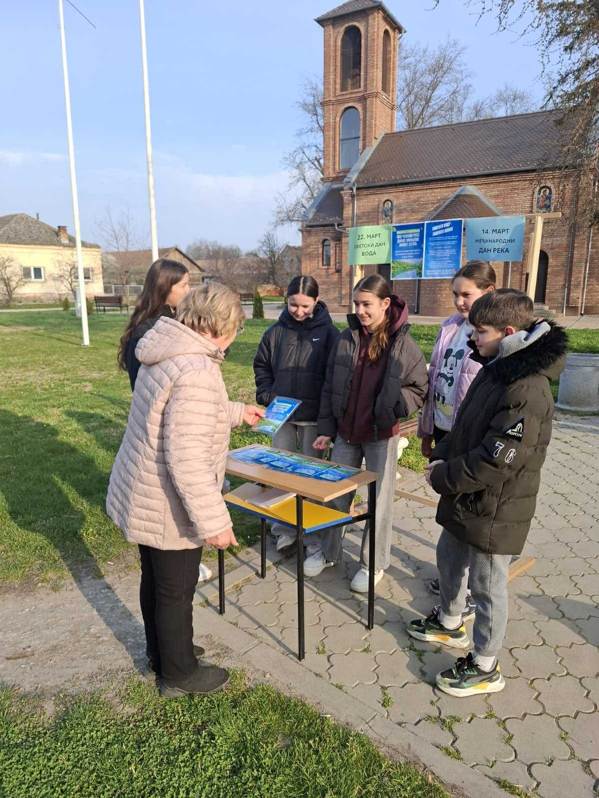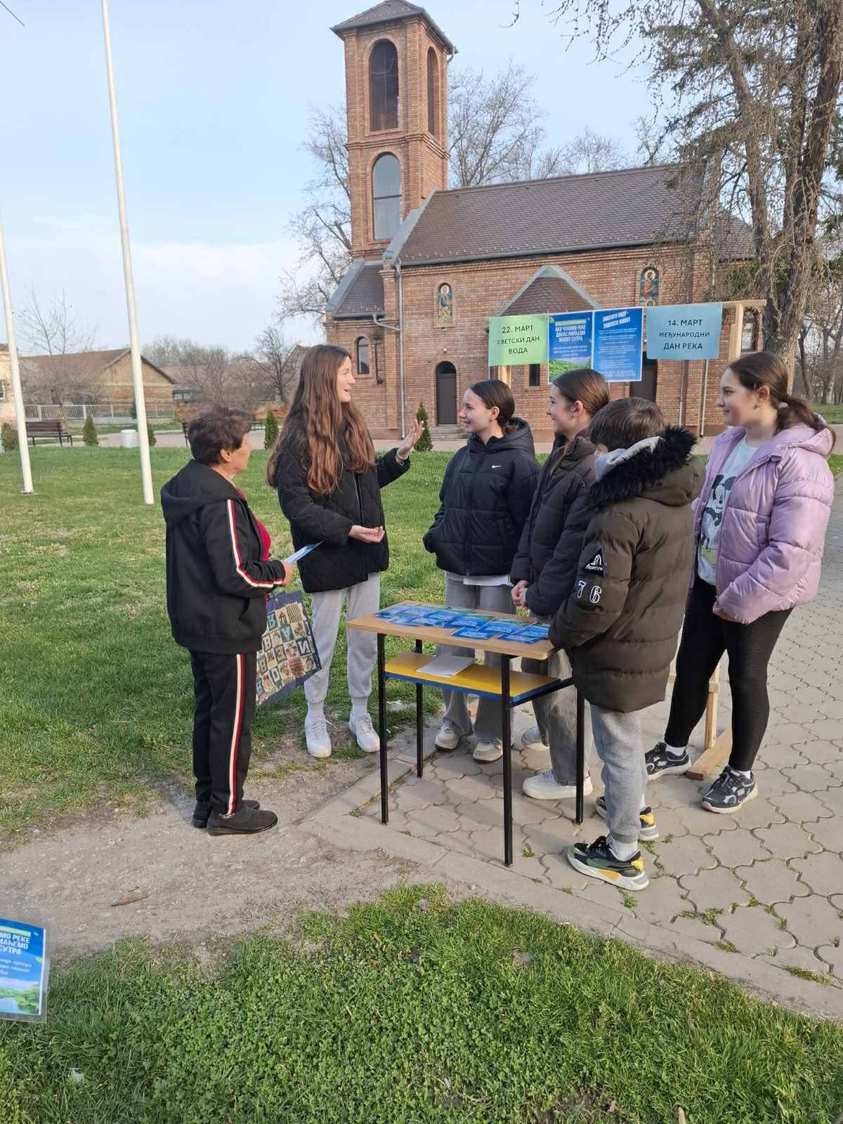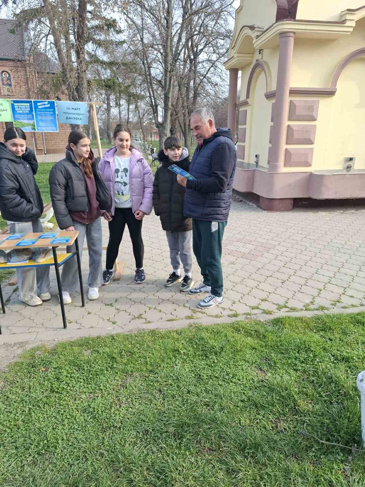 У близини сеоске пијаце је постављен штанд на ком су ученици разговарали са суграђанима о важности очувања река и подели су том приликом и припремљене флајере.